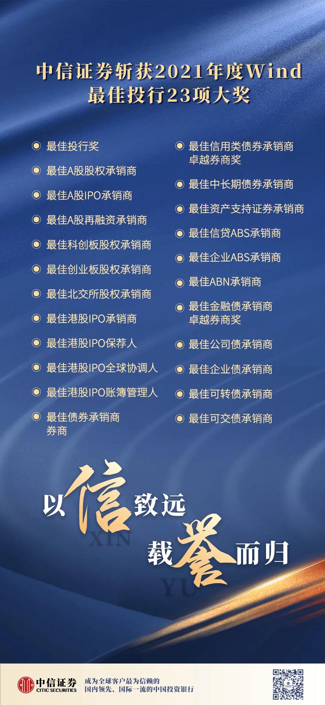 2021年度Wind最佳投行获奖名单日前揭晓,中信证券及中信里昂证券凭借领先的专业优势和卓越的境内外投行服务,斩获“最佳投行奖”“最佳A股股权承销商”“最佳港股IPO保荐人”“最佳债券承销商”和“最佳资产支持证券承销商”等23个券商类最佳奖项。