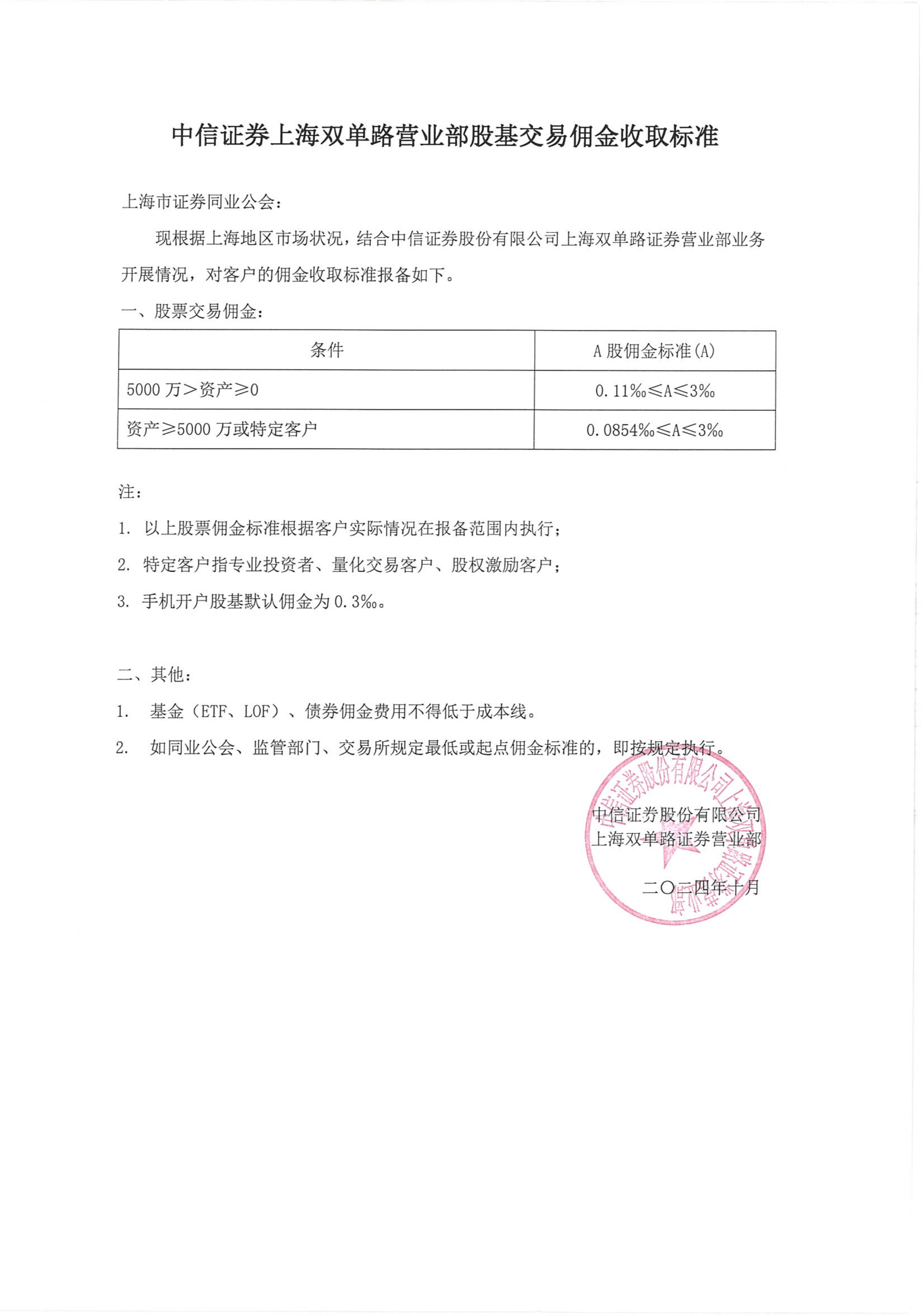 中信证券上海双单路营业部股基交易佣金收取标准202410